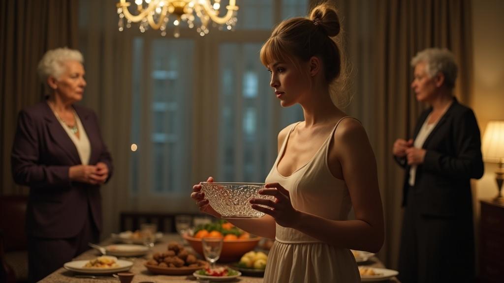 Леся стояла в центре зала, крепко сжимая в руках хрустальную салатницу — так сильно, что побелели суставы пальцев. Воздух был густым и душным, пропитанным ароматом оливье, дорогих духов золовки и застарелой фальшью.
