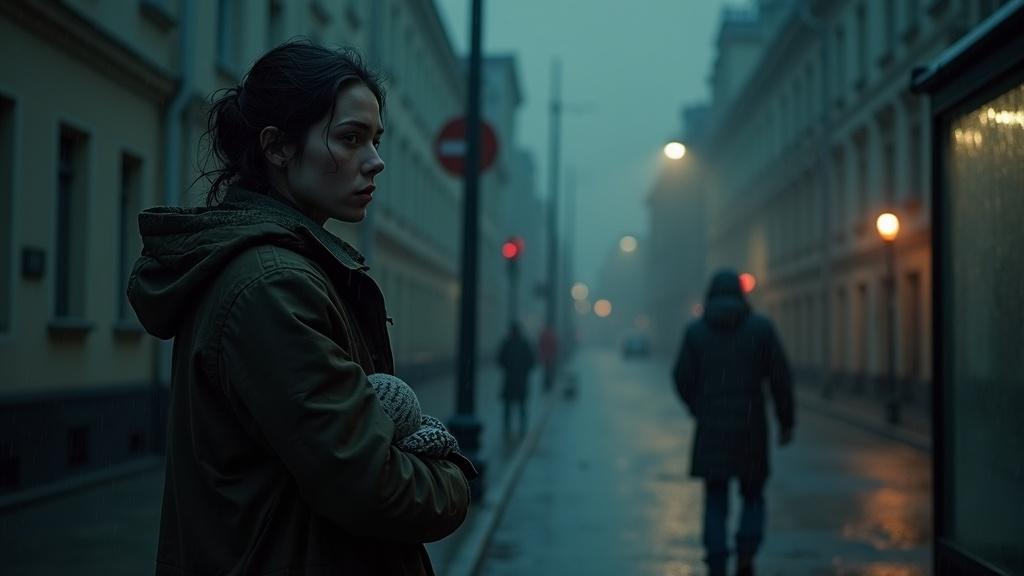 Сквозь пелену дождя показалась остановка — облупленная, с разбитым стеклом. У стены стояла девушка, промокшая до нитки. В руках она держала свёрток, из которого выглядывал край детской шапочки. Под глазом — старый синяк с зеленовато-жёлтым оттенком.