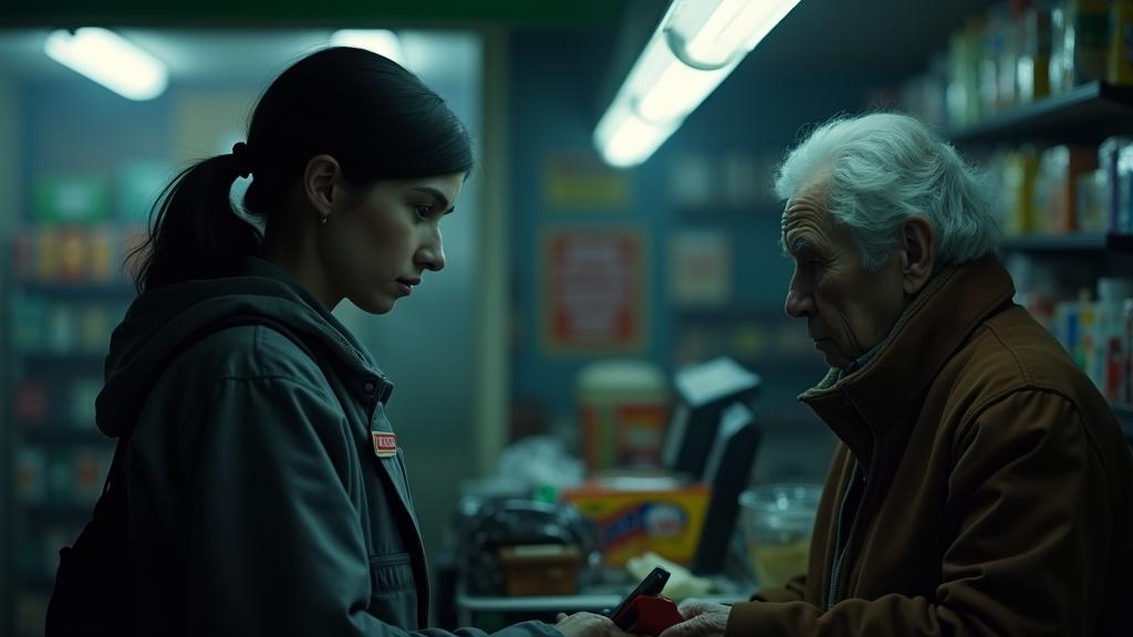 К ленте подошла Ганна — пожилая женщина небольшого роста с хрупкой фигурой в выцветшем пальто цвета осенней листвы. Это пальто явно пережило другую эпоху и хранило отпечаток прошлой жизни. Её руки дрожали; тонкие пальцы с прозрачной кожей осторожно выкладывали покупки: половинку ржаного хлеба, самый дешёвый пакет молока и одну чисто вымытую морковь.