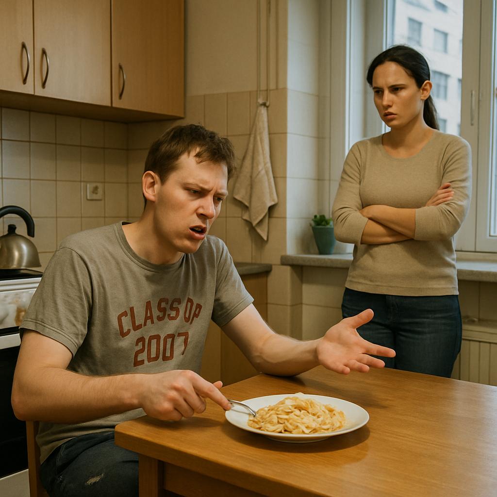 Оксана стояла у мойки и медленно выдыхала сквозь зубы. Казалось, ещё мгновение – и сковородка сама взлетит в воздух и приземлится точно в лоб этому самозваному гурману.