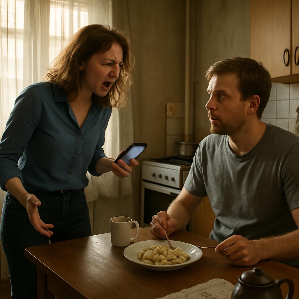 Марьяна влетела в квартиру, не удосужившись снять обувь. В руке горел экран телефона с уведомлением из банка. Она направилась на кухню, где муж спокойно ел пельмени за столом.