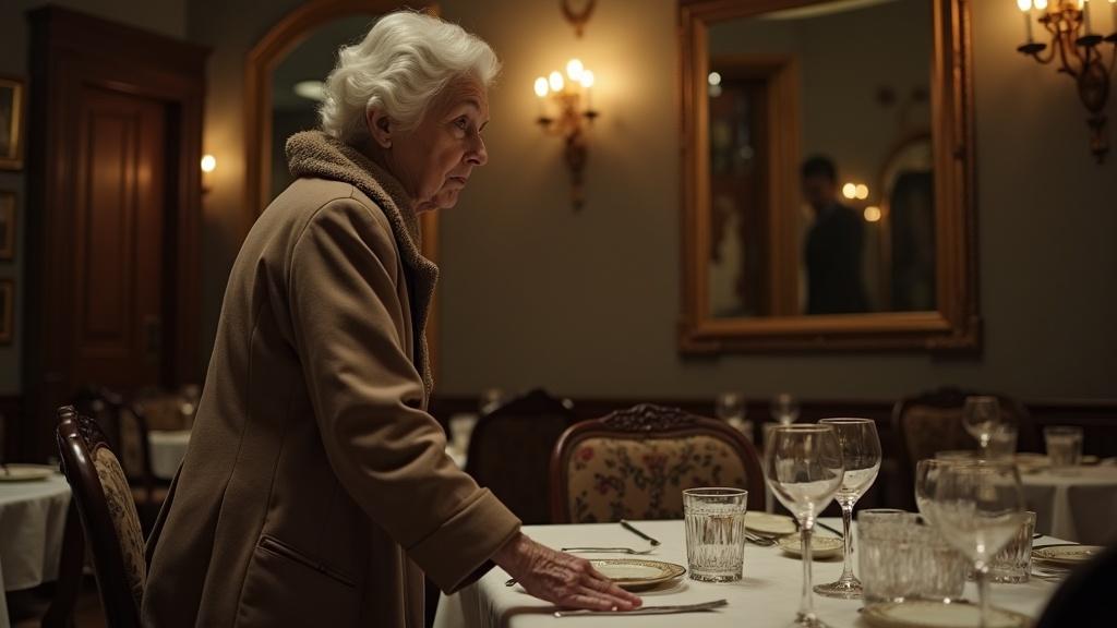 После недолгой паузы её всё же проводили к столику в самом углу зала, почти вплотную к стене. Посетители, расположившиеся за столами с белоснежными скатертями, начали украдкой посматривать в её сторону. Между ними пробегали любопытные взгляды: кто эта пожилая женщина, осмелившаяся появиться в месте, куда обычно приходят лишь обеспеченные люди? Казалось, блеск хрусталя и приглушённое сияние люстр подчёркивали, насколько она выбивается из общей картины.
