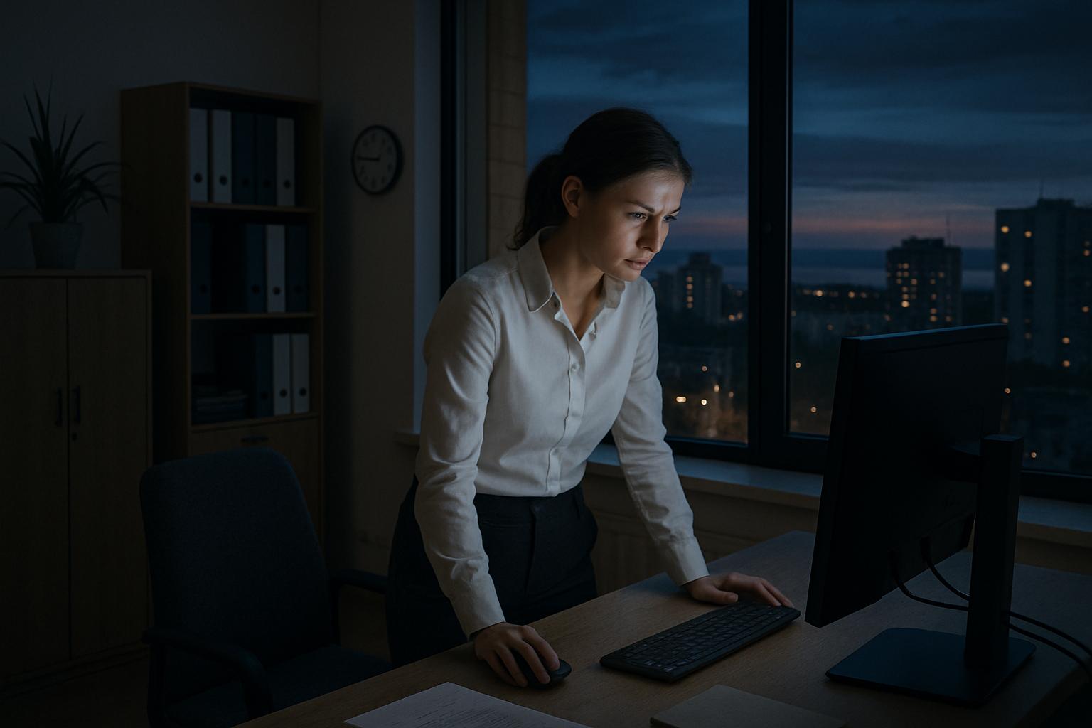 Оксана стояла у офисного окна и наблюдала, как за стеклом постепенно сгущаются сумерки. На часах было уже половина десятого. Сотрудники разошлись ещё пару часов назад, лишь уборщица время от времени появлялась в коридоре со шваброй. А Оксана по‑прежнему не отрывалась от монитора, дописывая последний раздел отчёта по проекту.